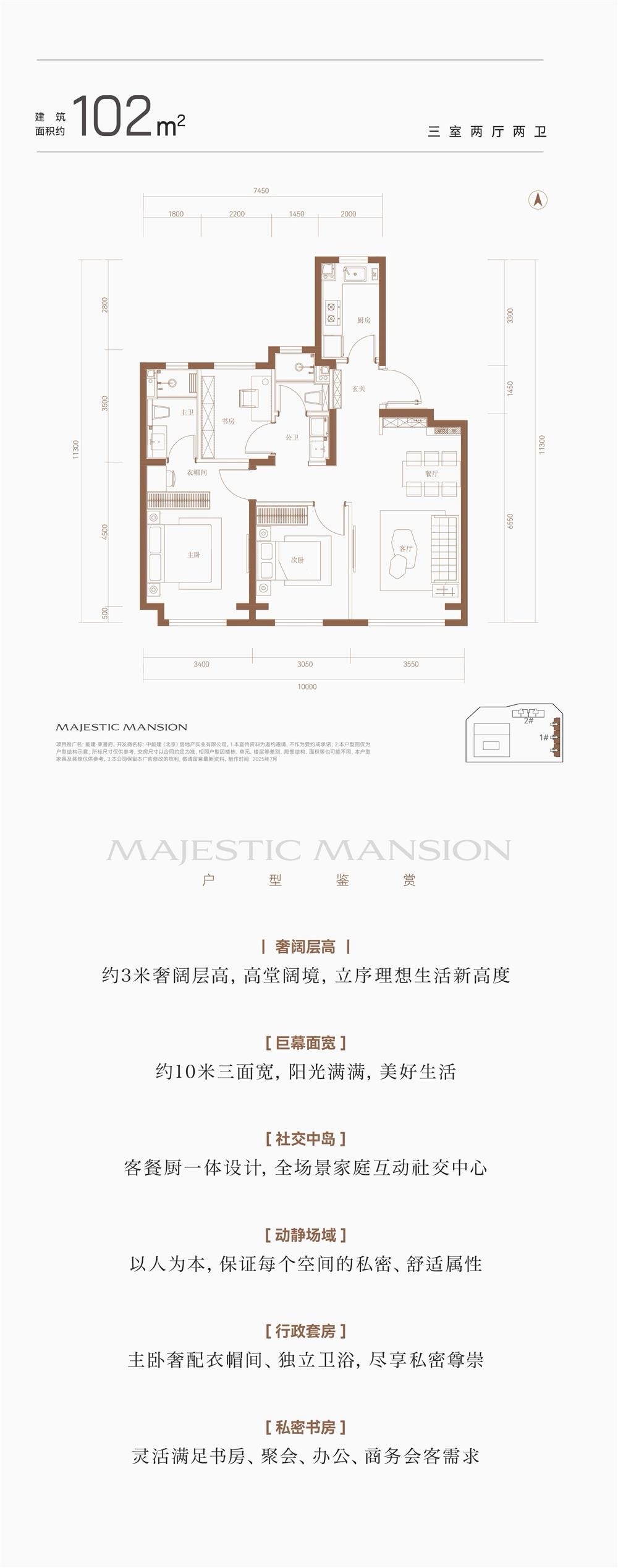 功能布局:客餐厨一体设计,打造家庭社交中心;主卧配备独立卫浴及衣帽间,兼顾隐私与便利性;